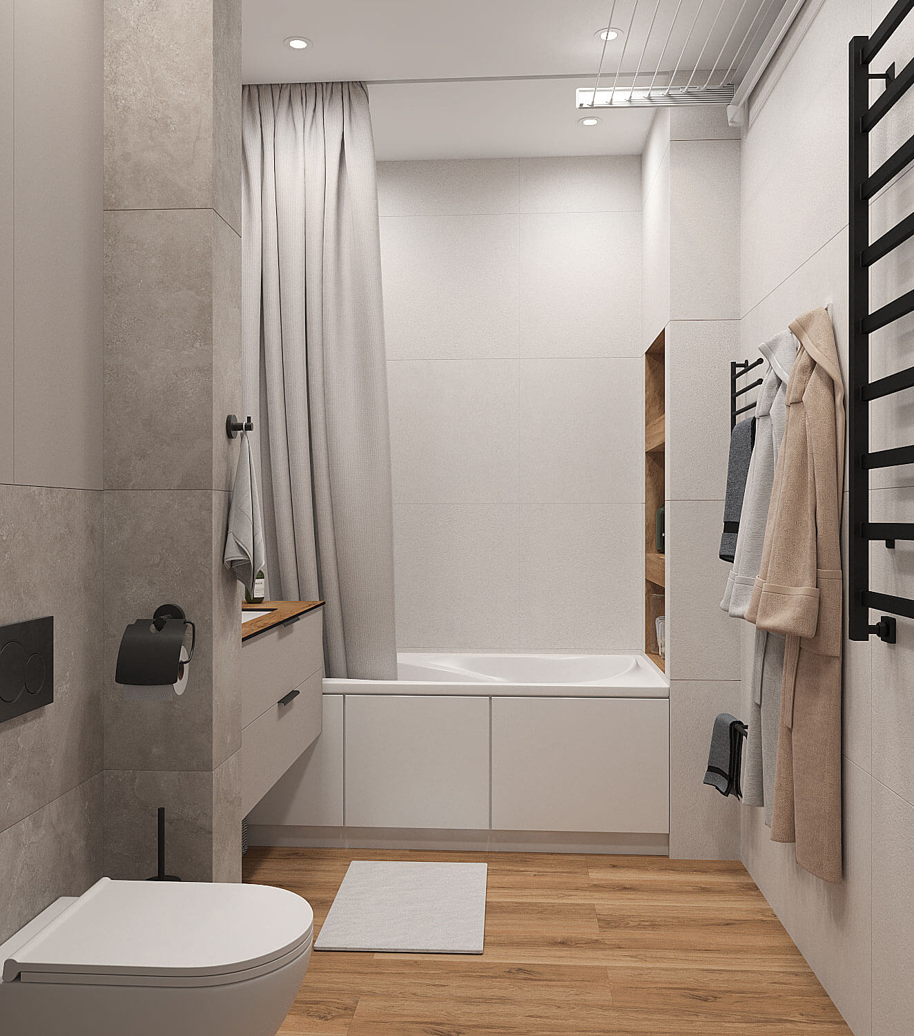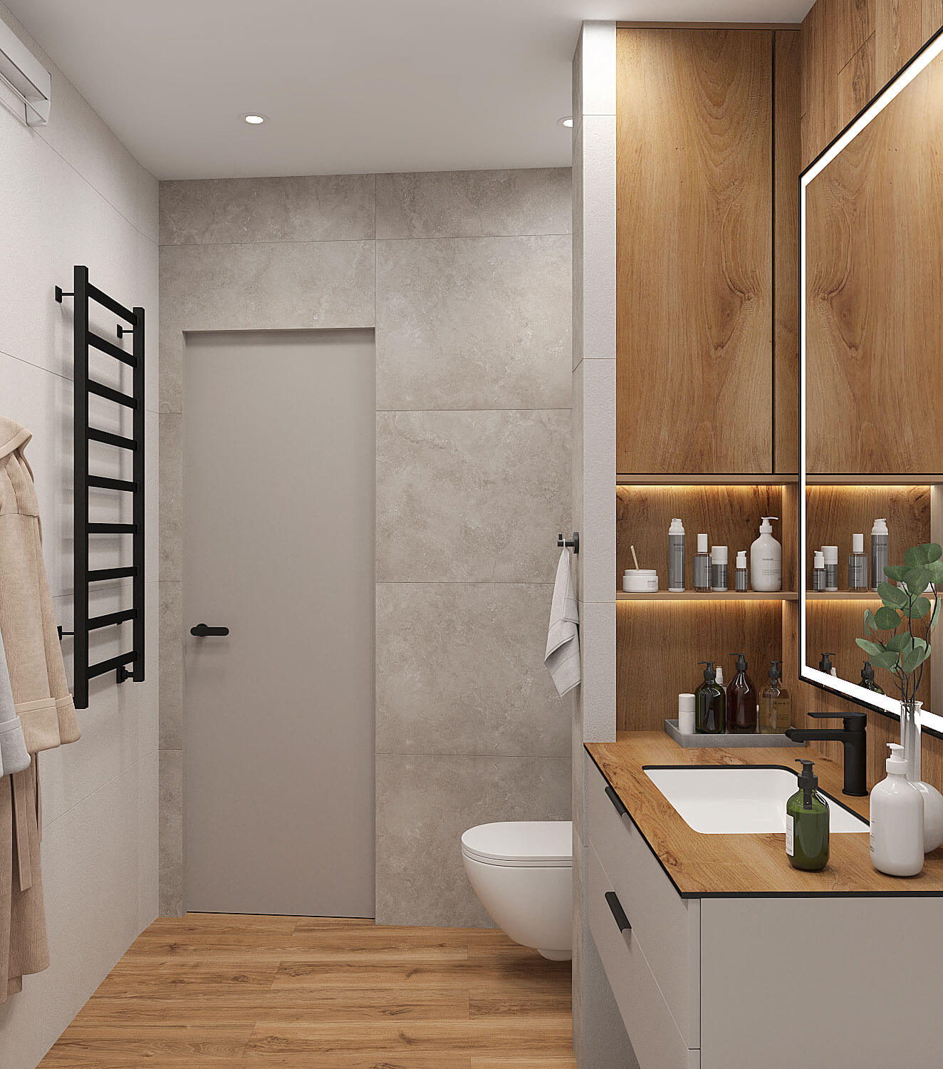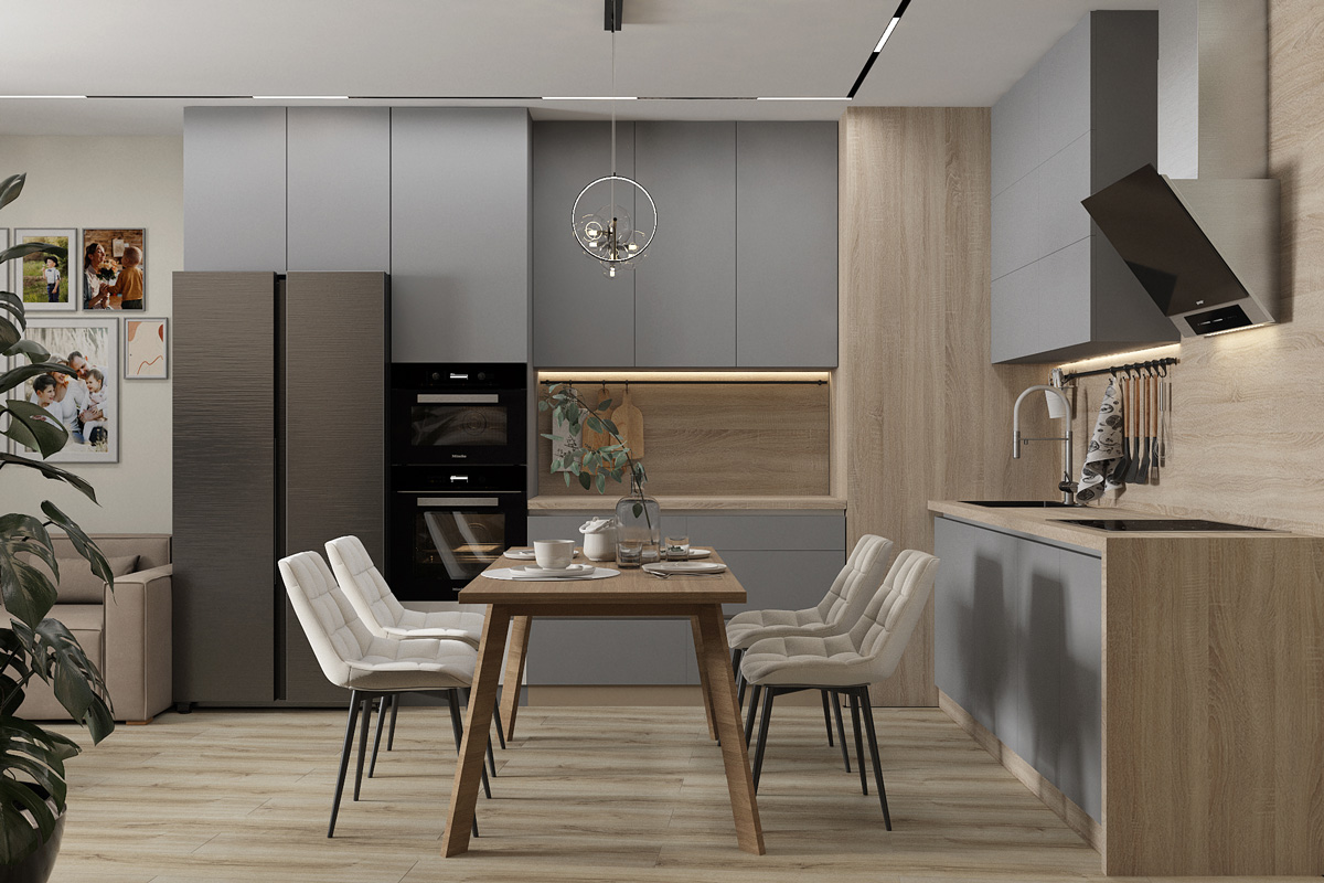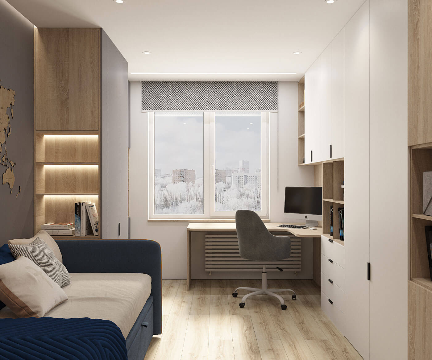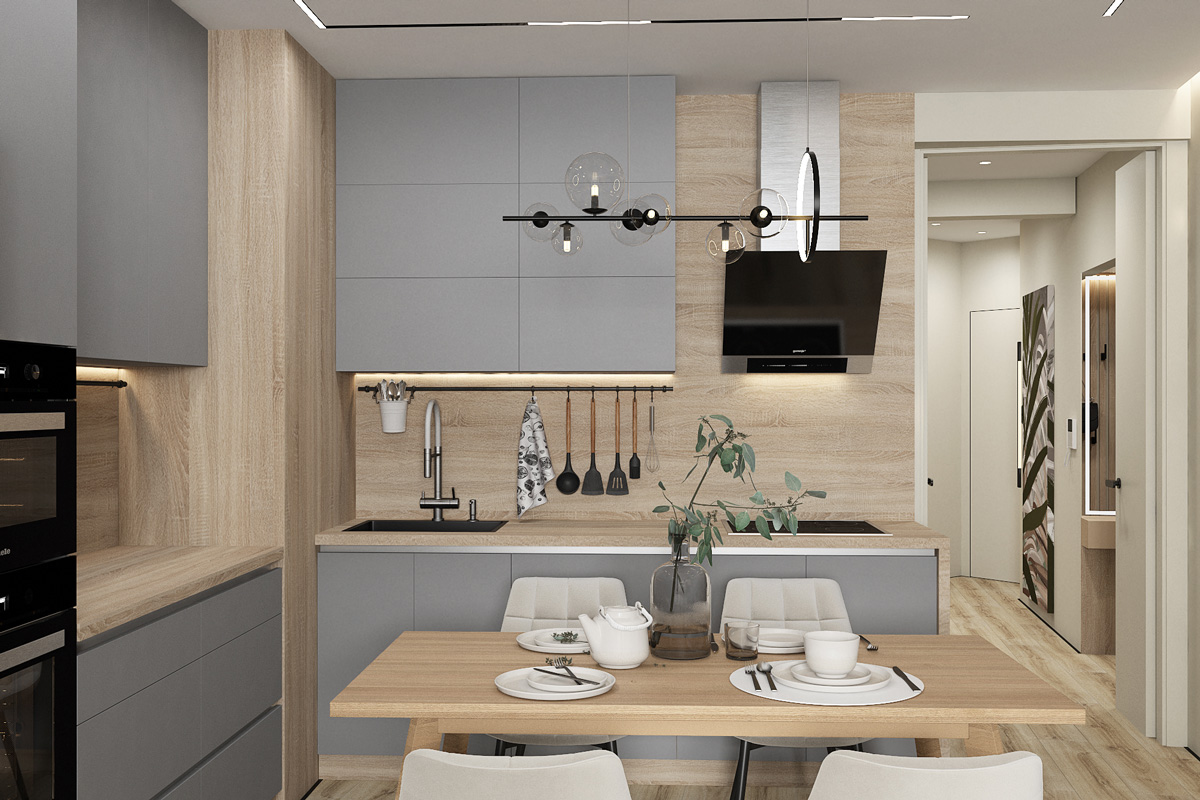 A design project involving the redevelopment from a 3-room + kitchen to a 3-bedroom + living room 98 m² apartment turned a typical problematic layout into a comfortable family space. We have completely redesigned the logic of the apartment, creating a spacious open-plan kitchen-living-dining room, two full-fledged children’s rooms, a master bedroom with a study and a separate bathroom, as well as a utility room. The interior combines modern techniques, Scandinavian conciseness and warm eco-motifs, with natural textures and a light, calm palette.