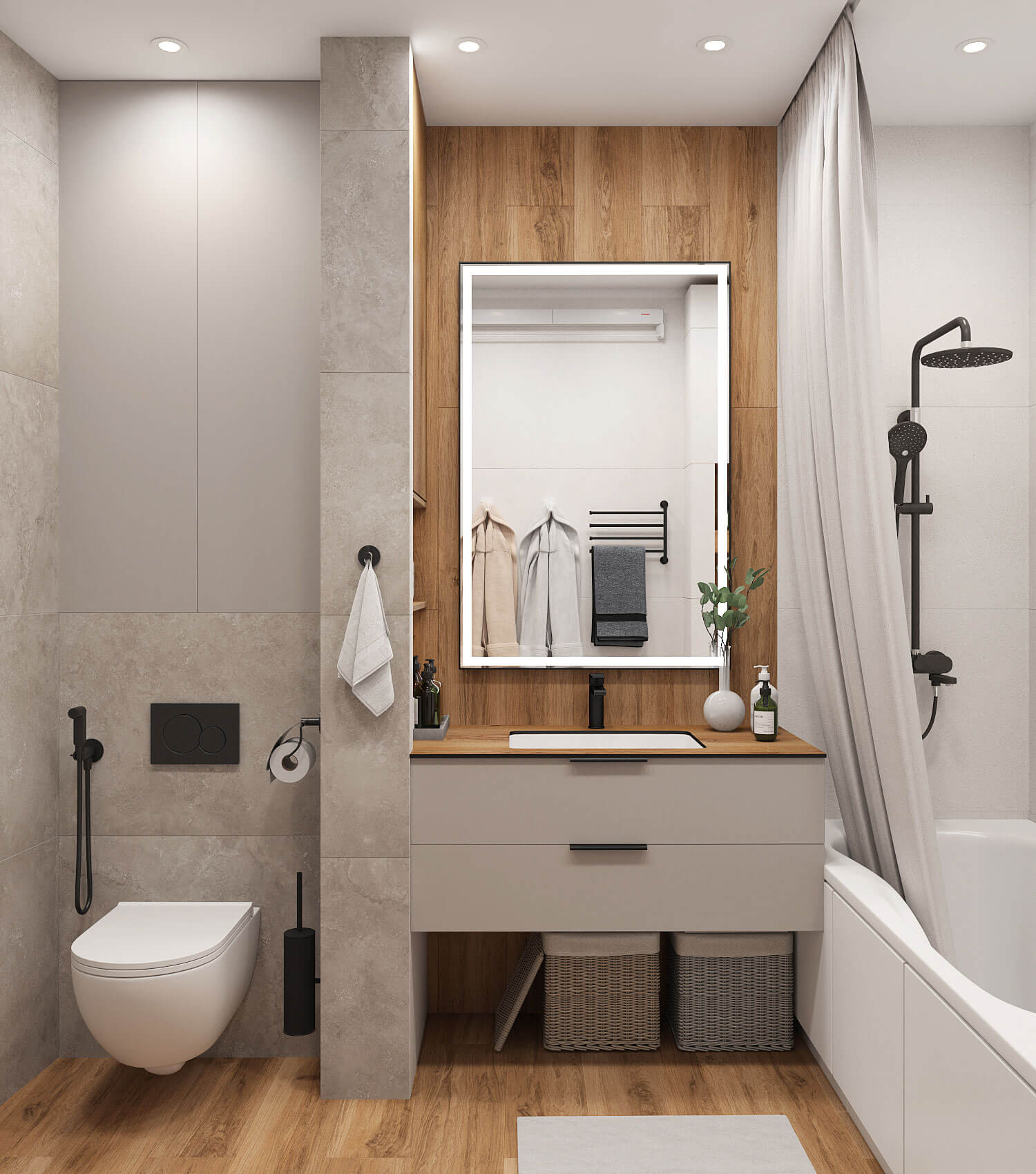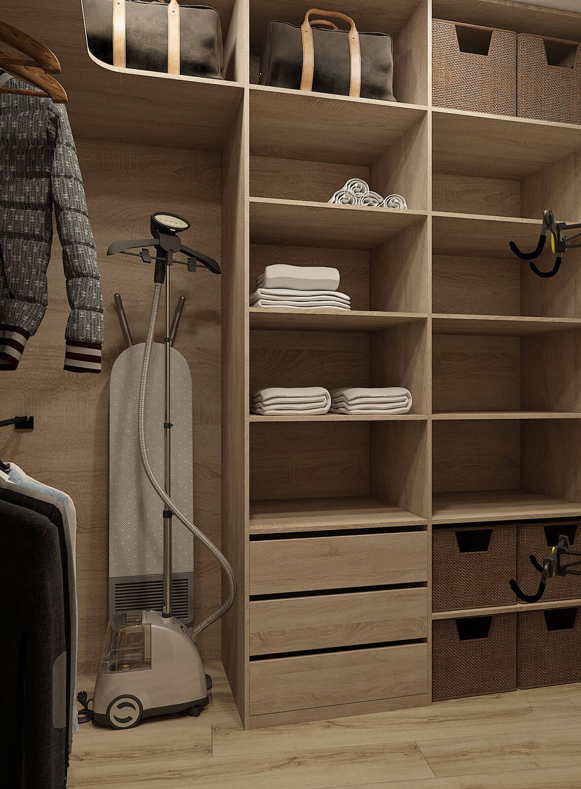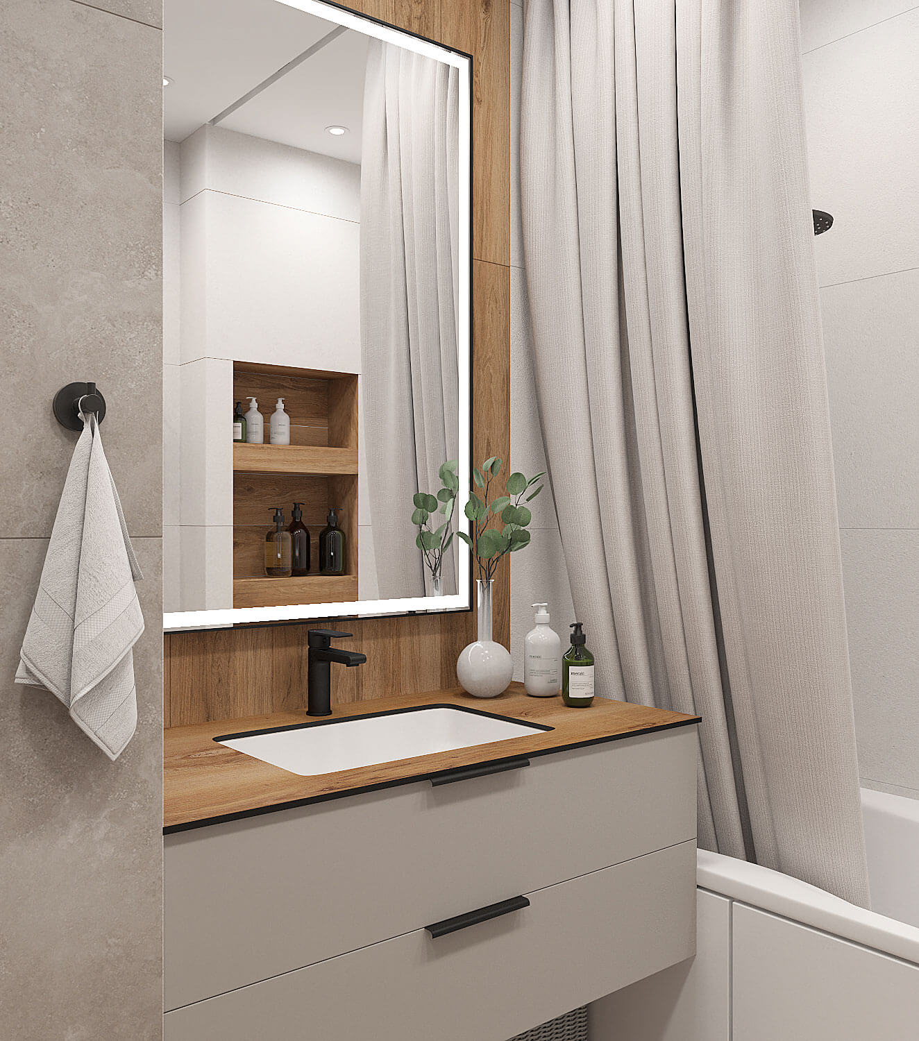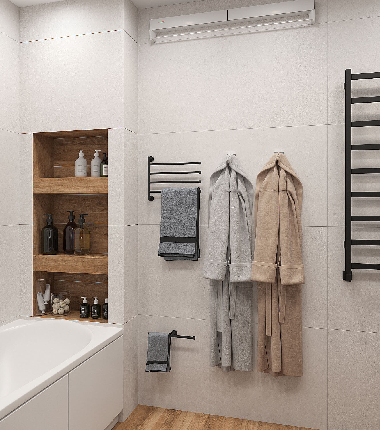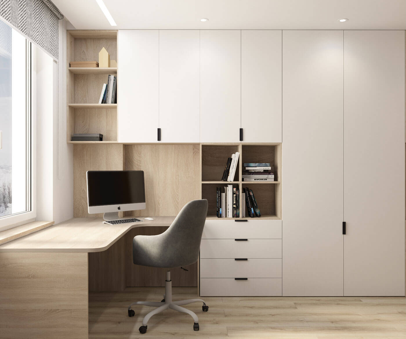 A design project involving the redevelopment from a 3-room + kitchen to a 3-bedroom + living room 98 m² apartment turned a typical problematic layout into a comfortable family space. We have completely redesigned the logic of the apartment, creating a spacious open-plan kitchen-living-dining room, two full-fledged children’s rooms, a master bedroom with a study and a separate bathroom, as well as a utility room. The interior combines modern techniques, Scandinavian conciseness and warm eco-motifs, with natural textures and a light, calm palette.
