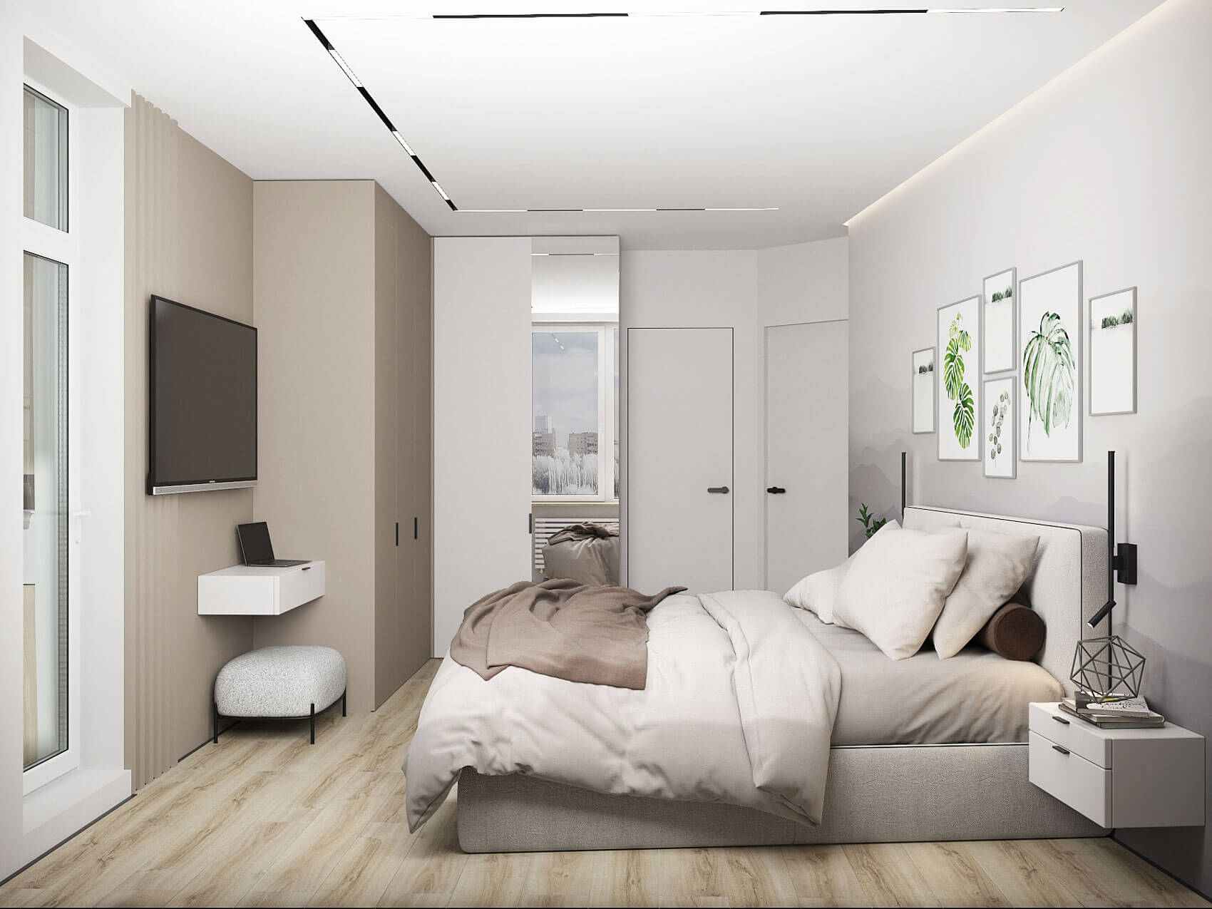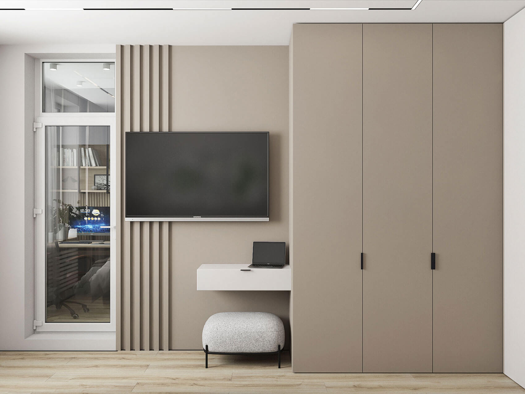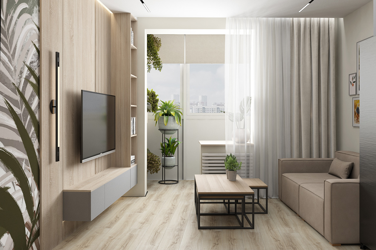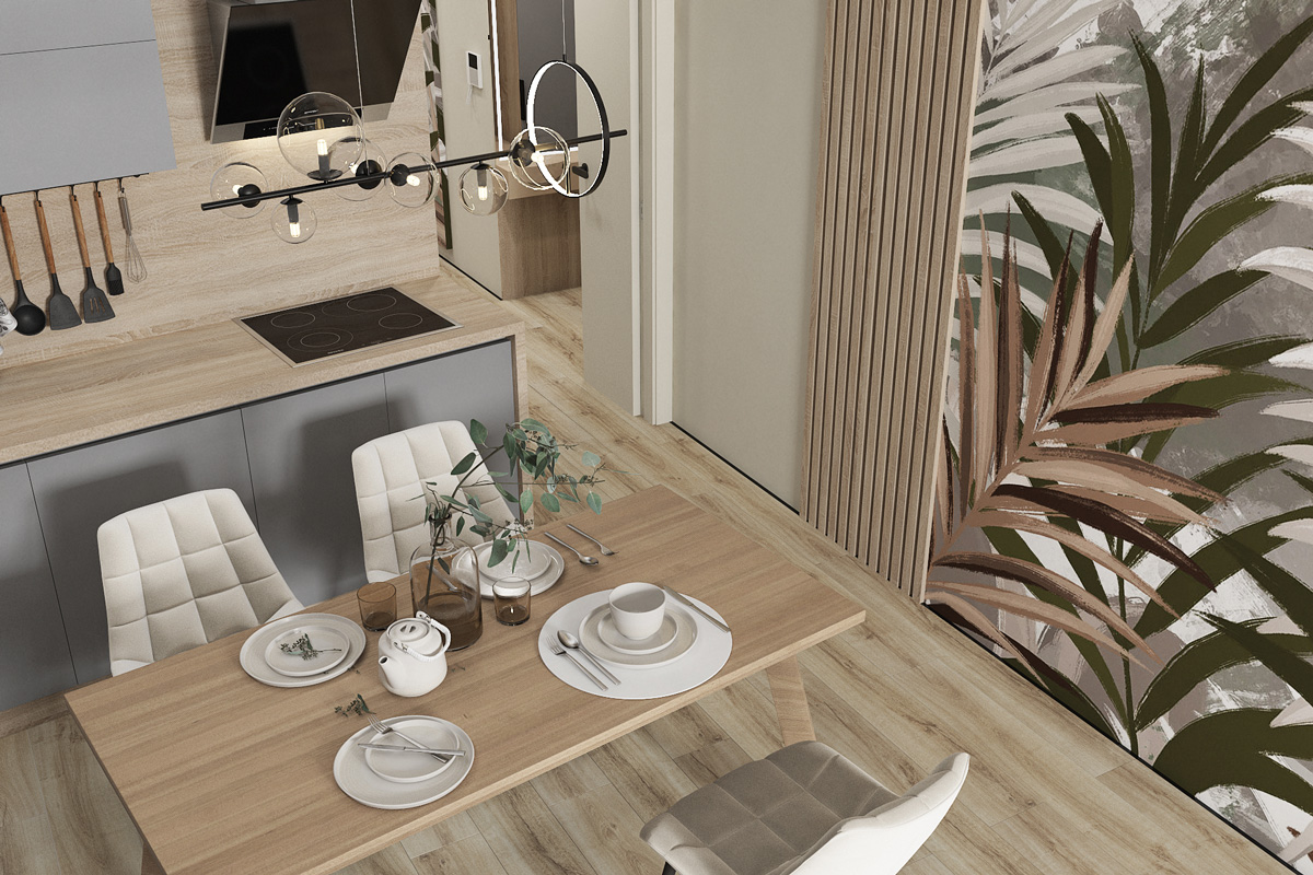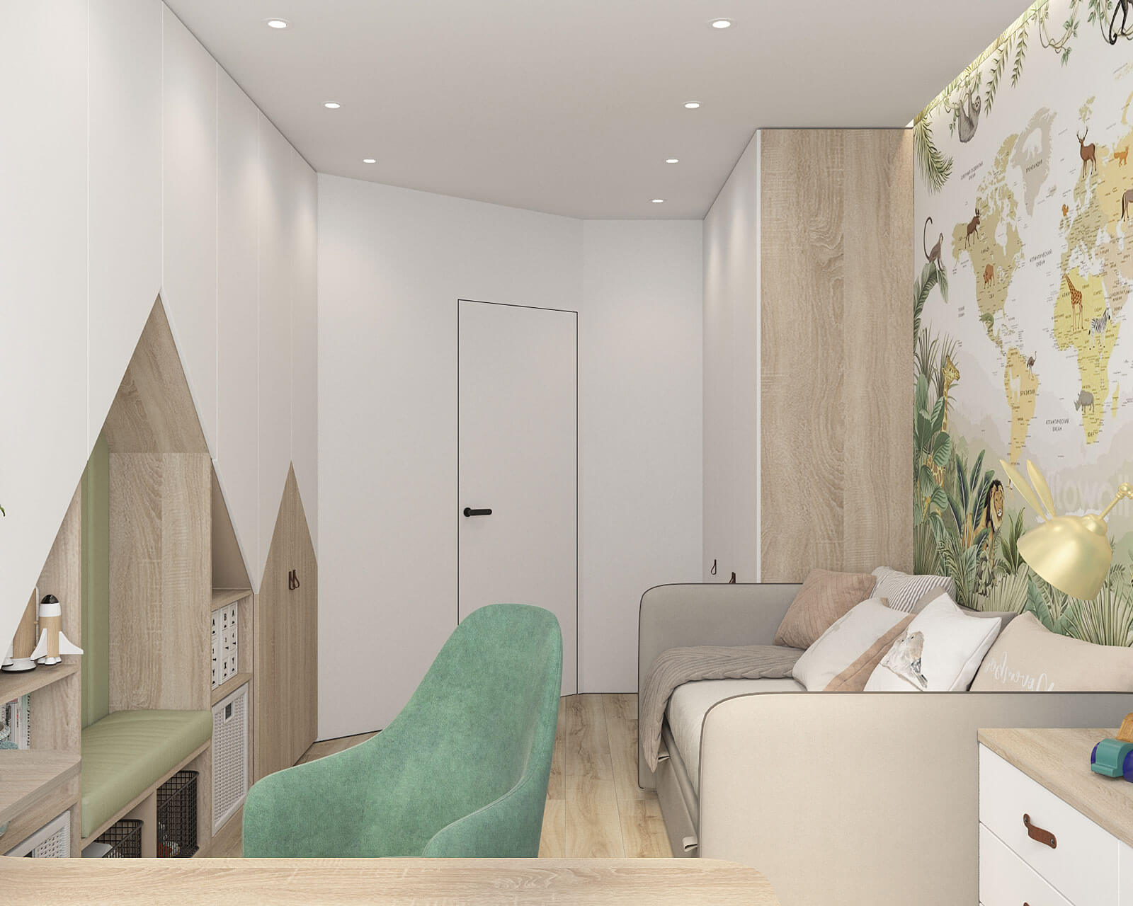 The design reflects a functional aesthetic blending modern solutions with Scandinavian minimalism and warm eco-inspired touches. Natural wood and textile textures, a beige-grey-green color palette, and custom wall prints with nature motifs create a calm, breathable, and welcoming atmosphere.