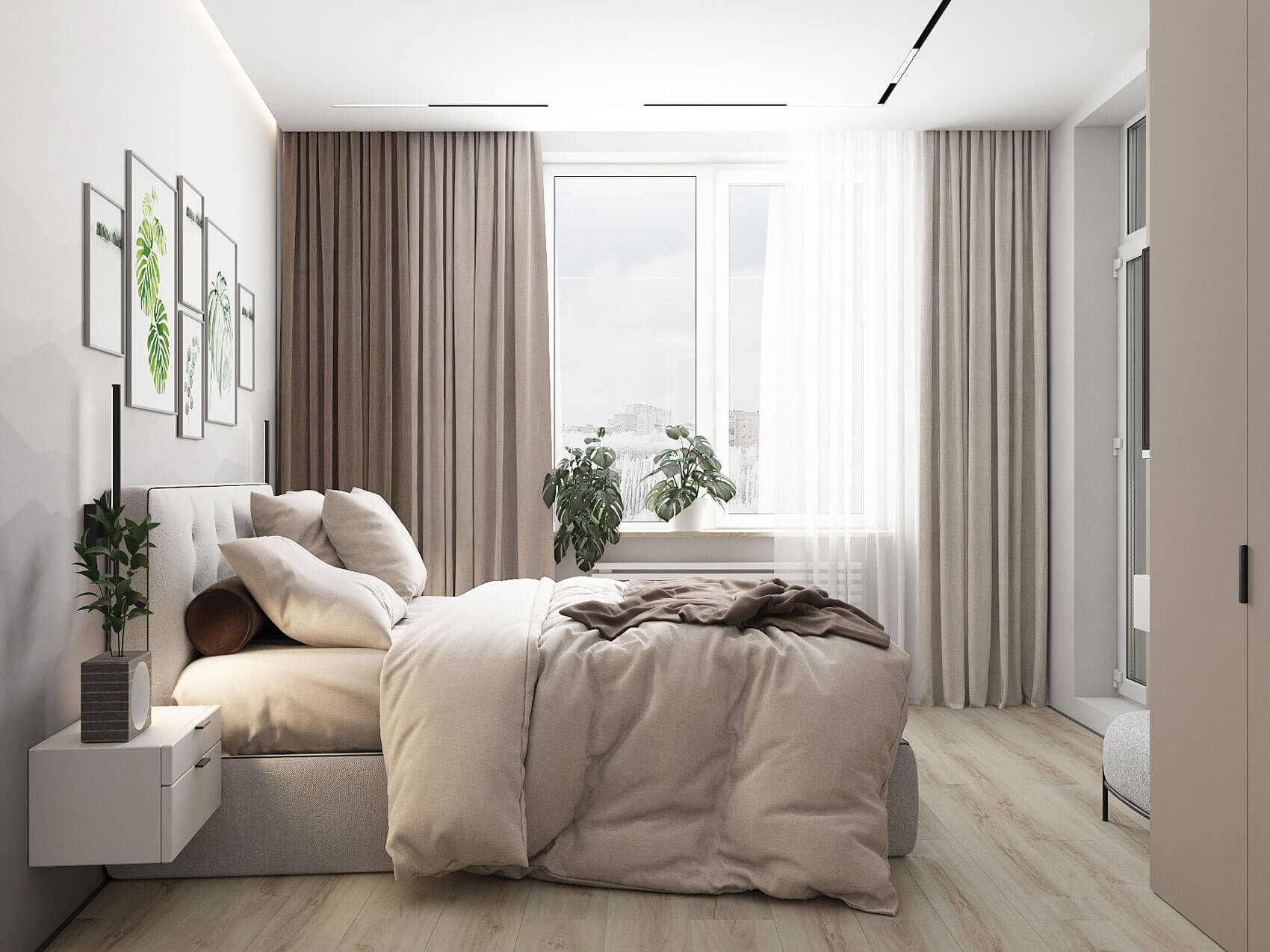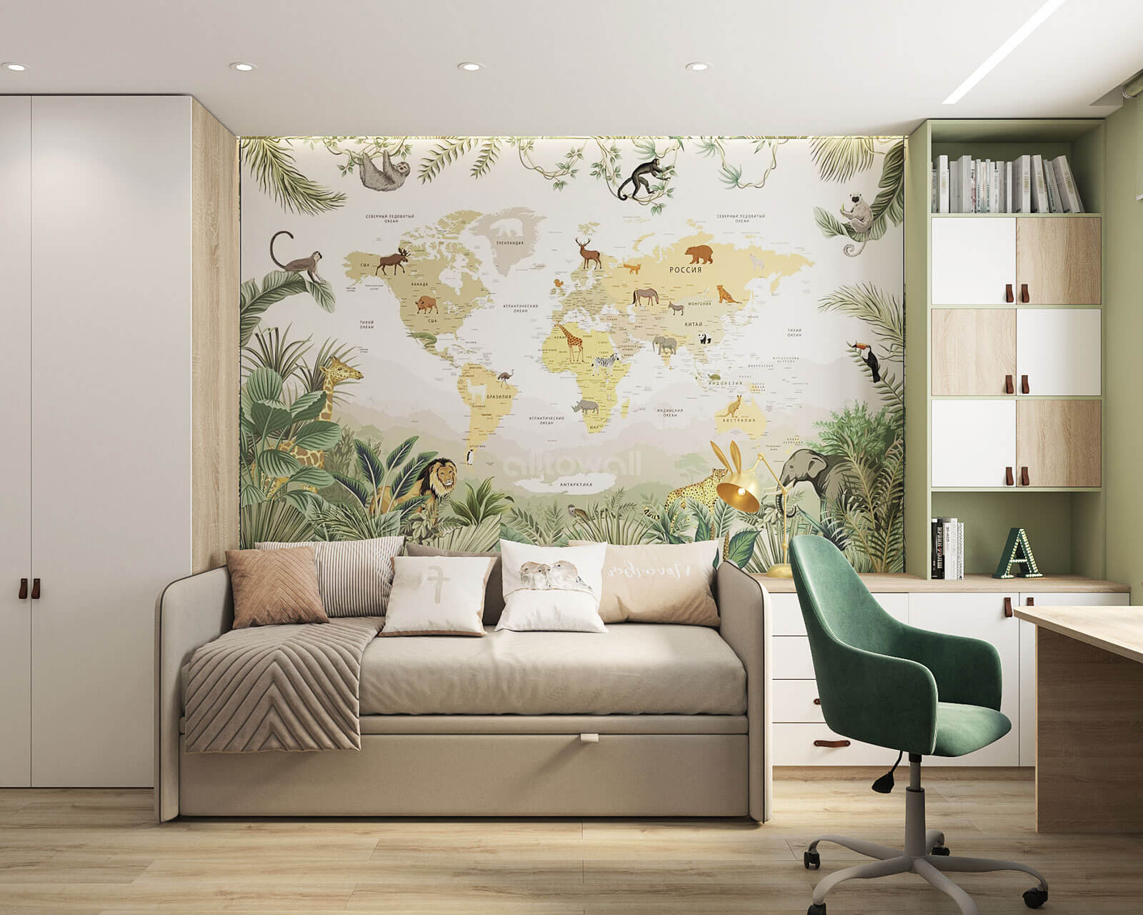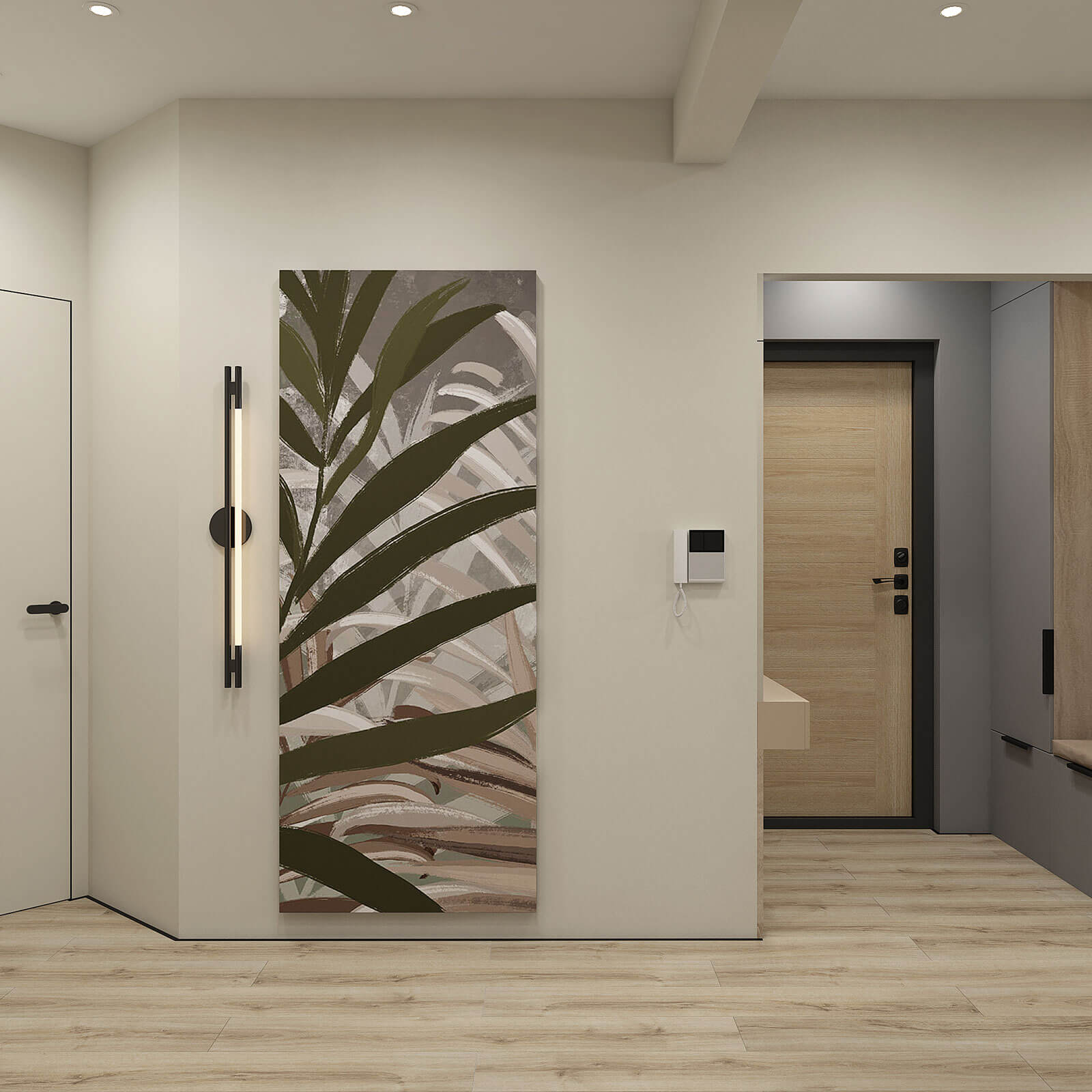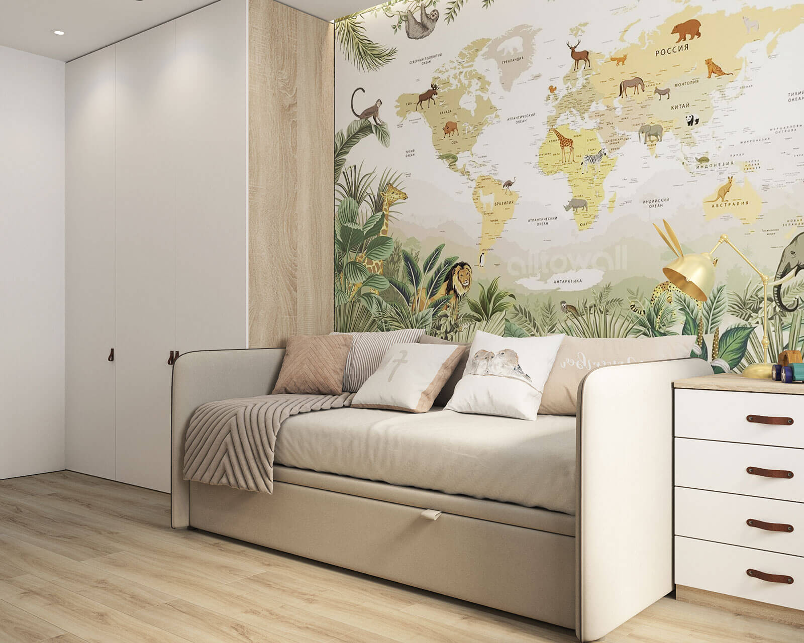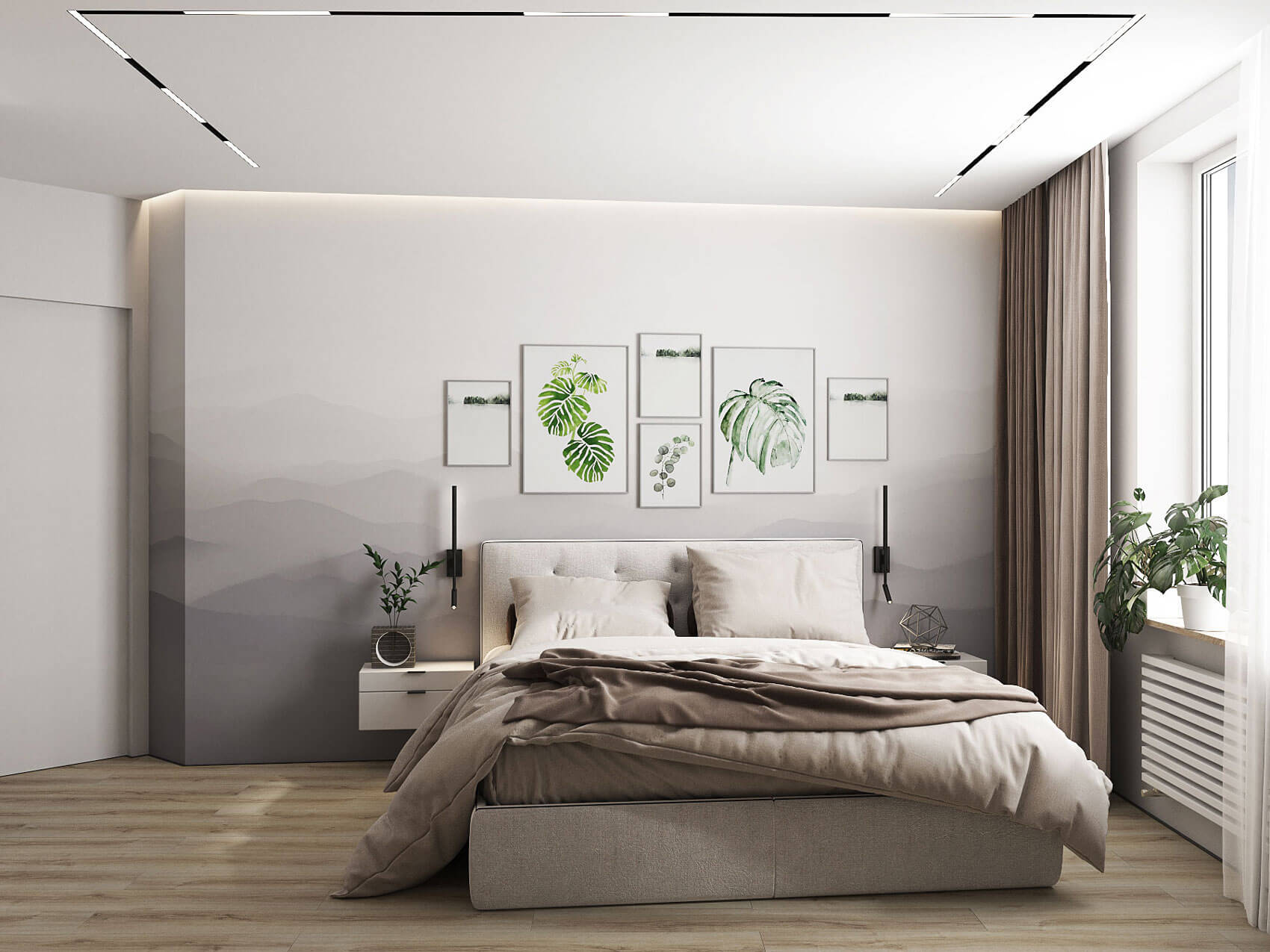 The design reflects a functional aesthetic blending modern solutions with Scandinavian minimalism and warm eco-inspired touches. Natural wood and textile textures, a beige-grey-green color palette, and custom wall prints with nature motifs create a calm, breathable, and welcoming atmosphere.