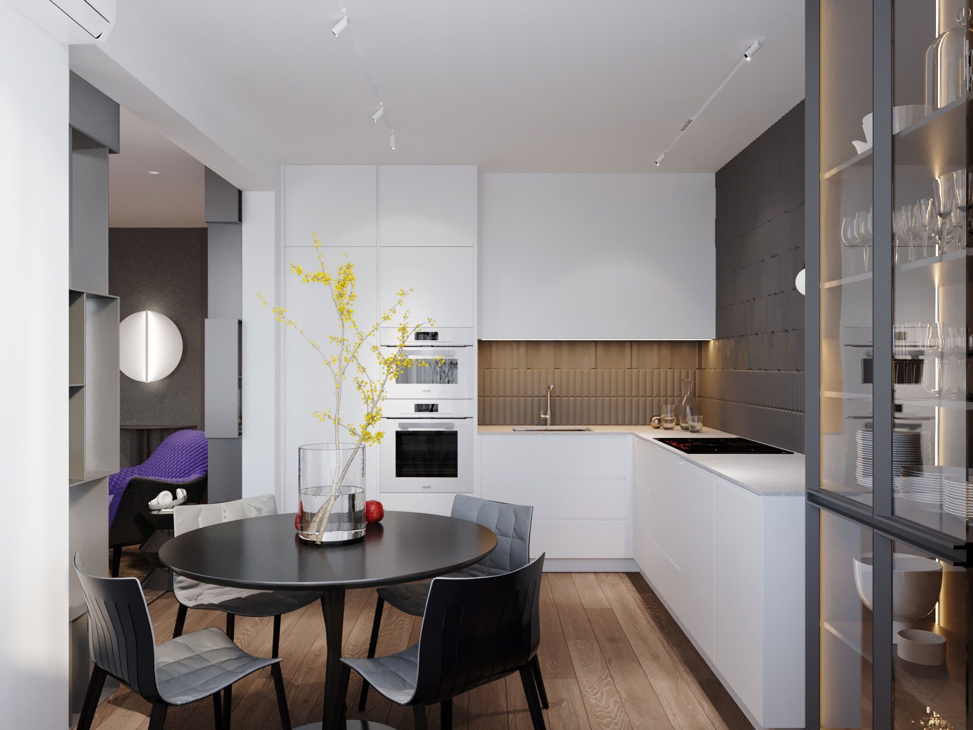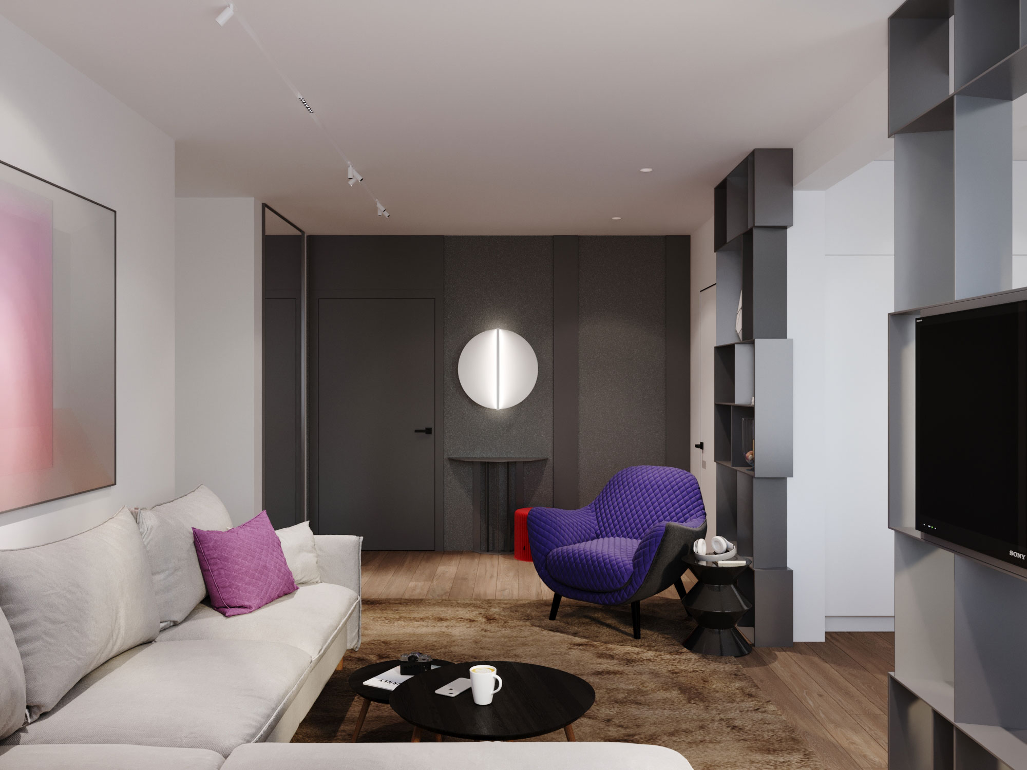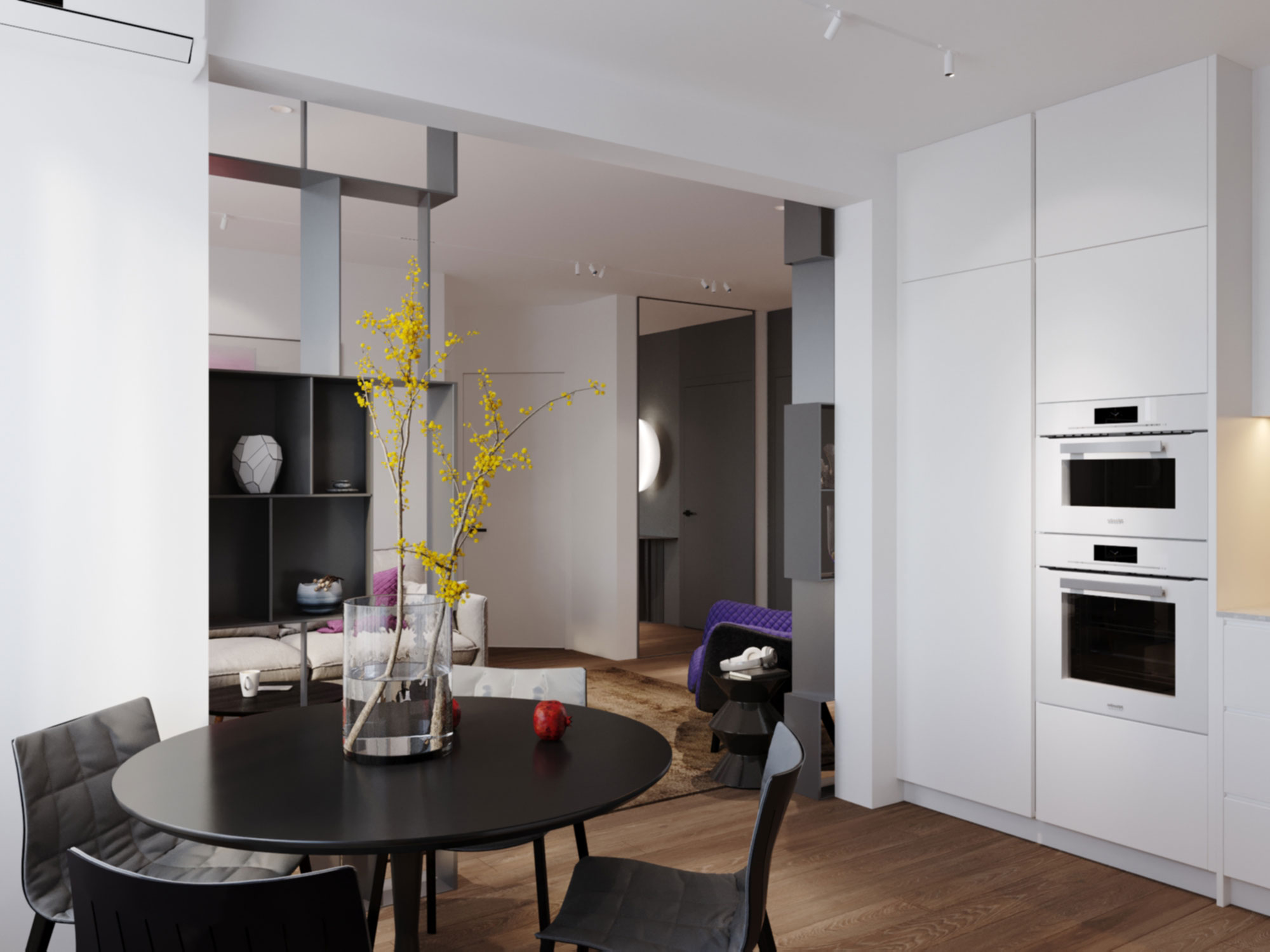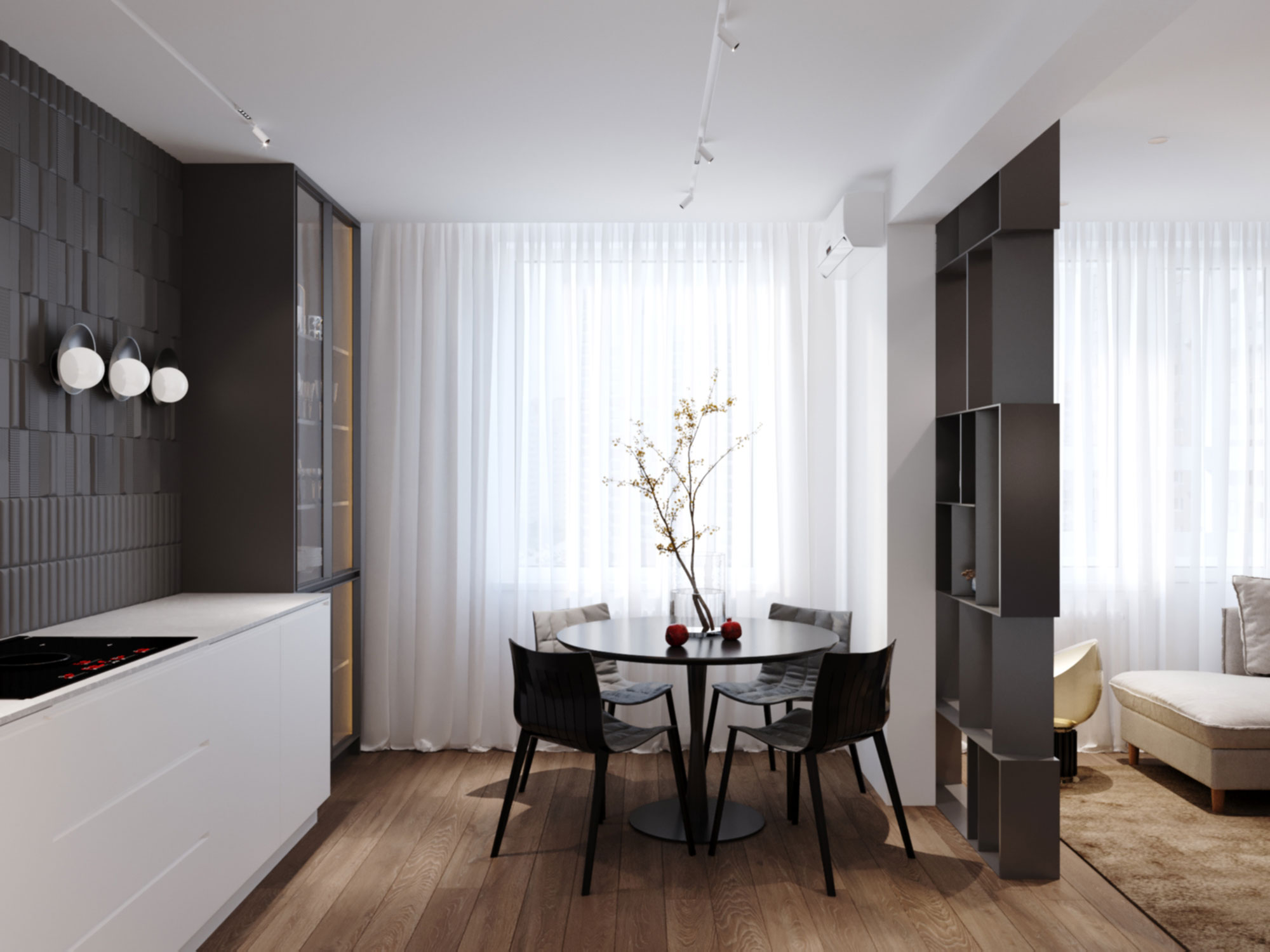 - Integrated storage systems: Compact built-in solutions were added throughout the apartment, preserving the minimalist aesthetic.