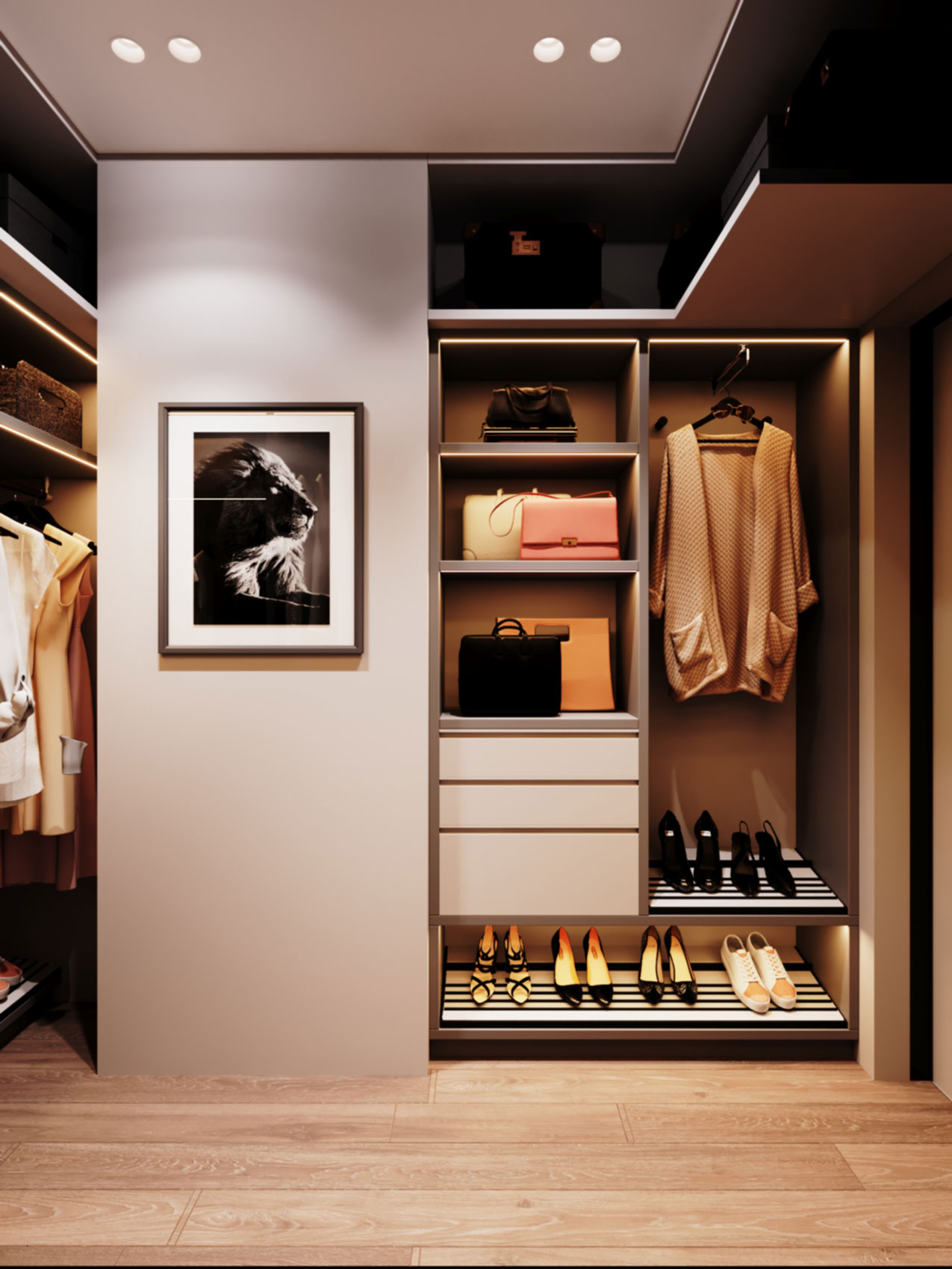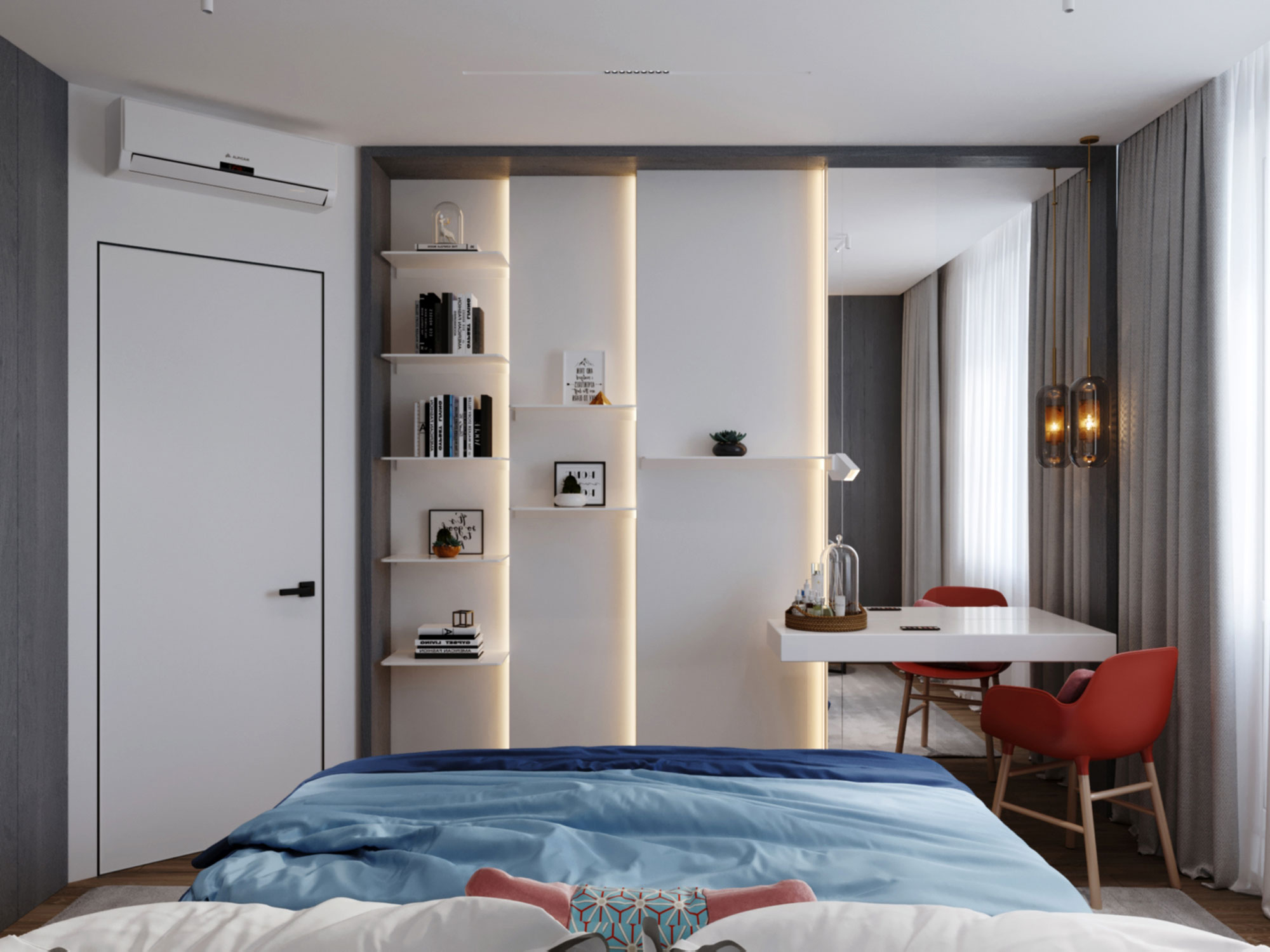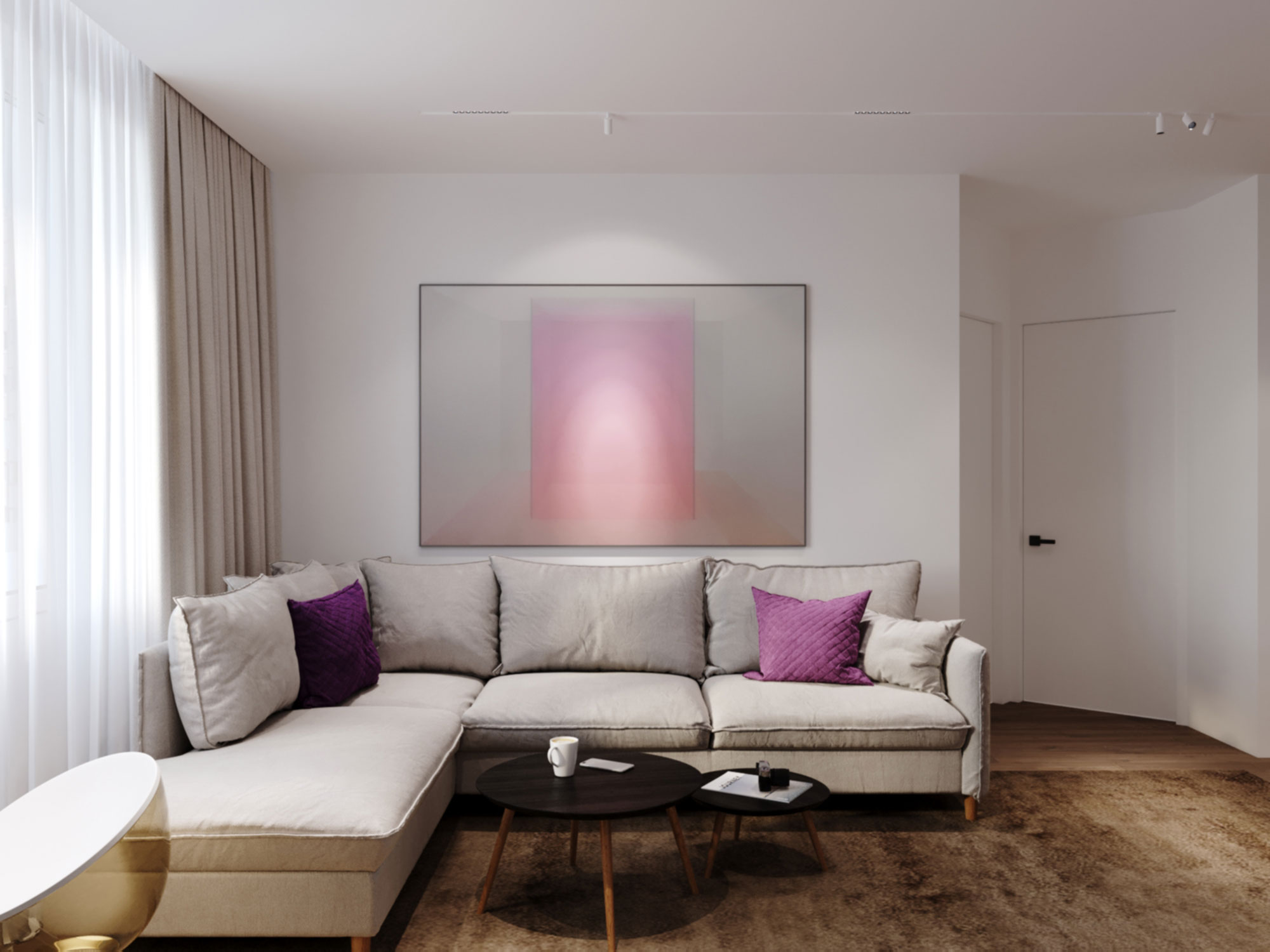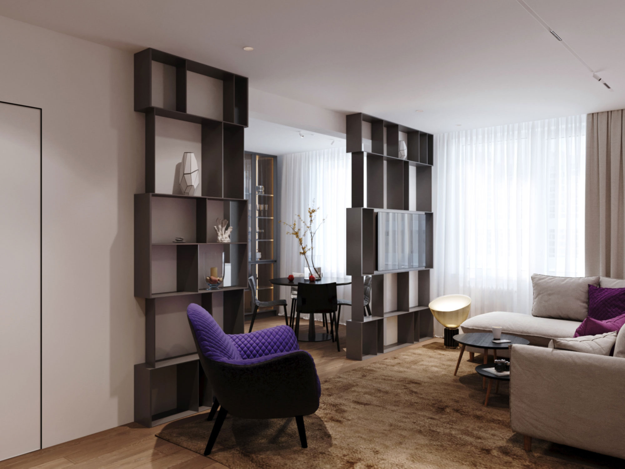- Integrated storage systems: Compact built-in solutions were added throughout the apartment, preserving the minimalist aesthetic.