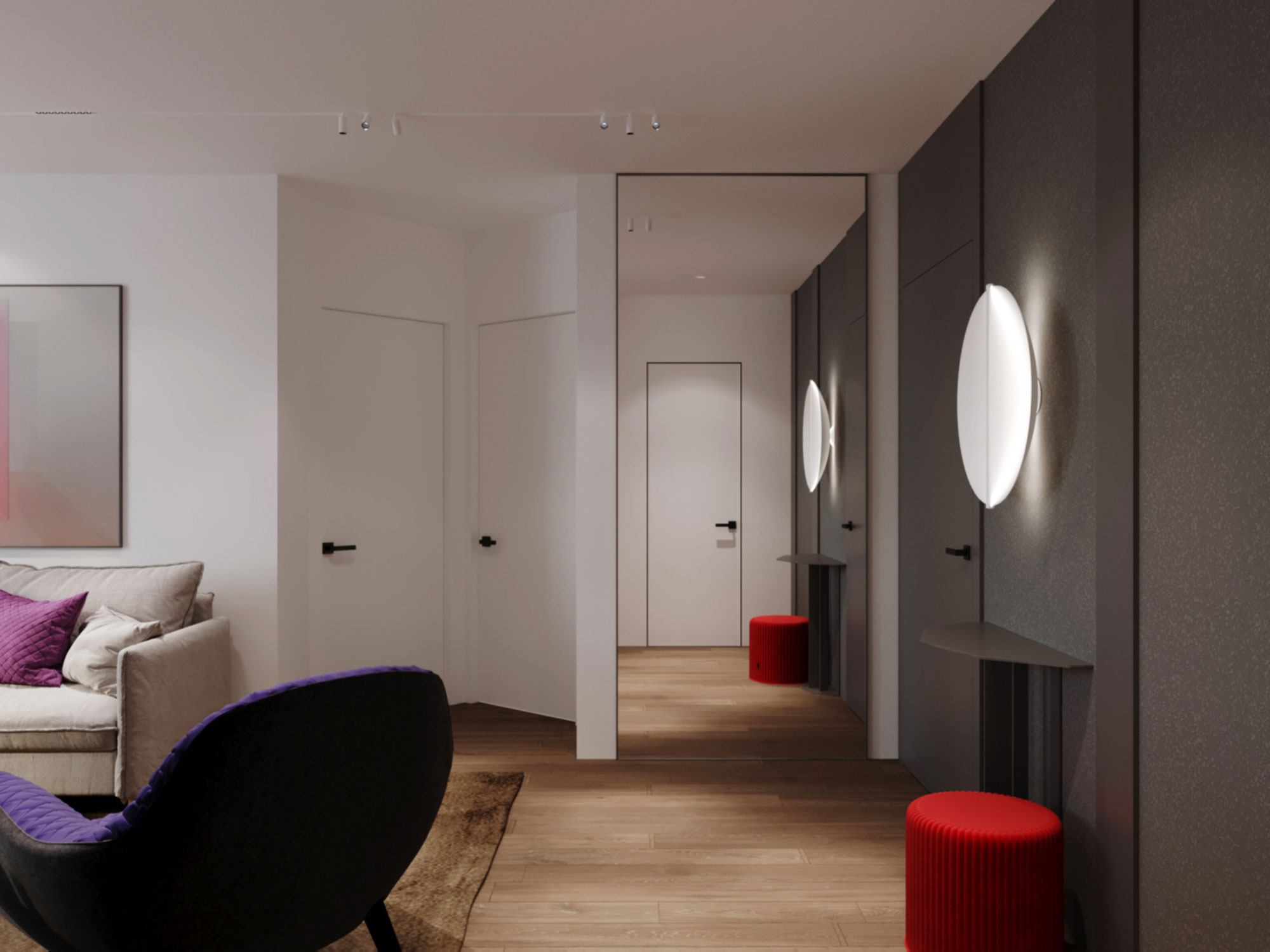This overextended and underused hallway became the key resource for radically improving spatial quality. We made the strategic decision to reallocate this area — transforming it into a larger living room, optimized entryway, and a walk-in wardrobe.