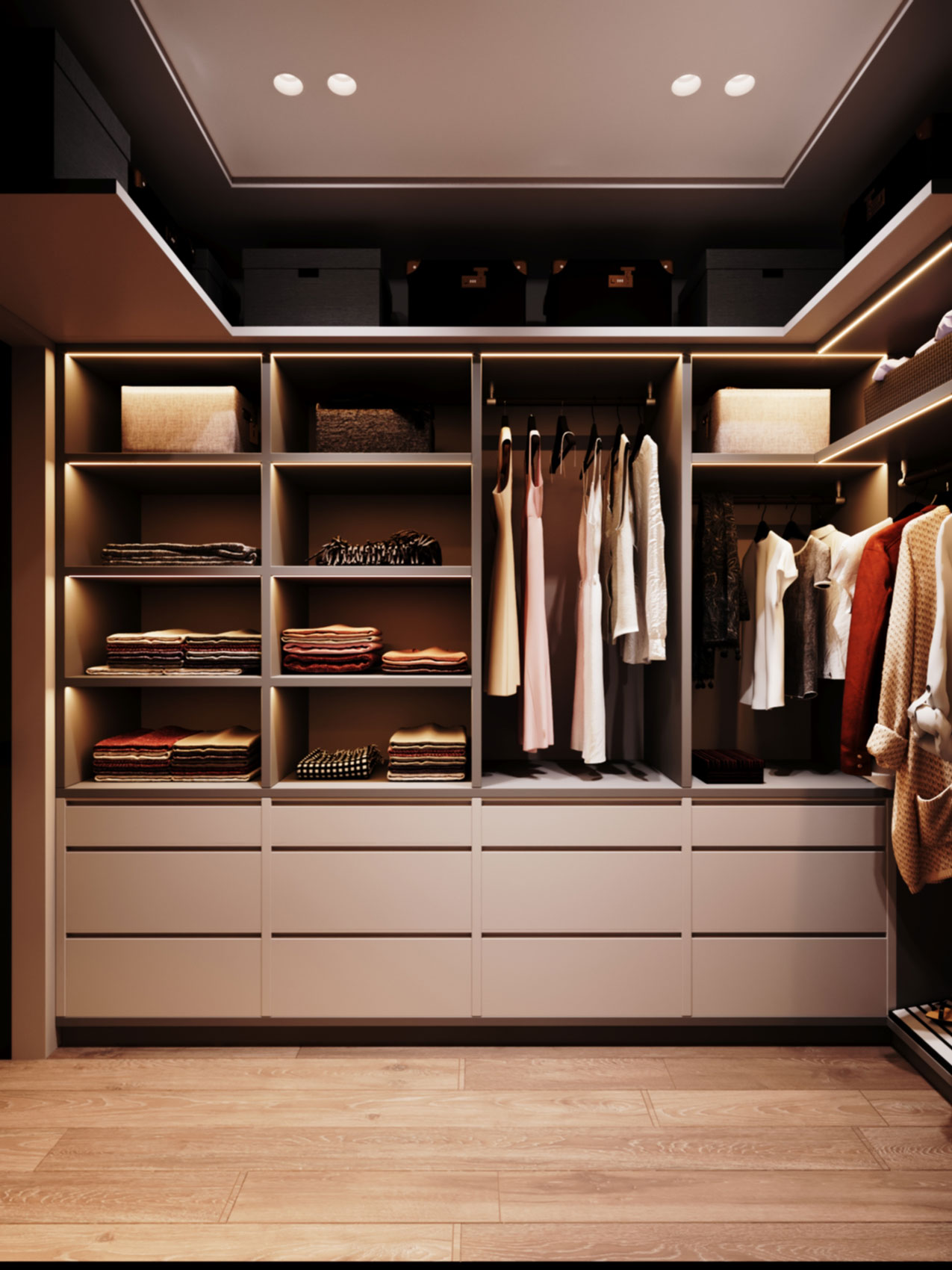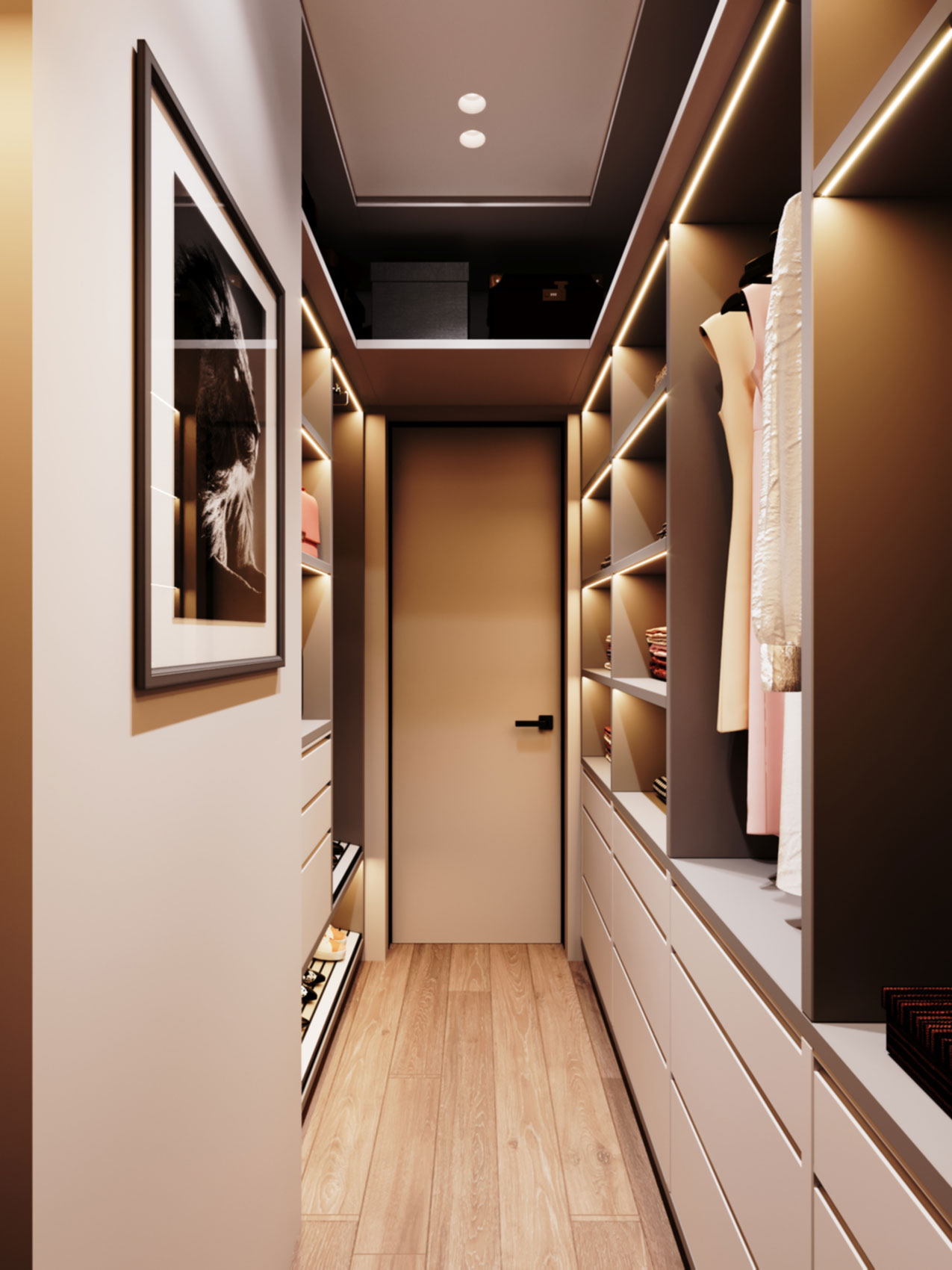 - Spacious walk-in wardrobe: By repurposing an unused second bathroom (2.2 m²) and part of the hallway, we designed a roomy 4.4 m² storage area, fully solving the issue of organization.