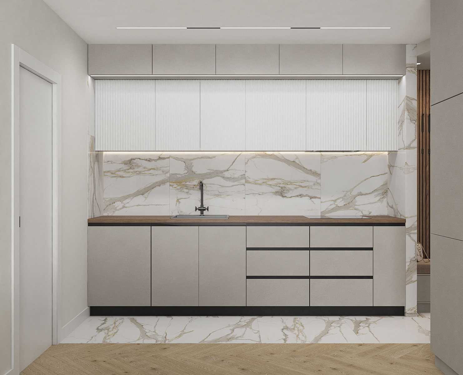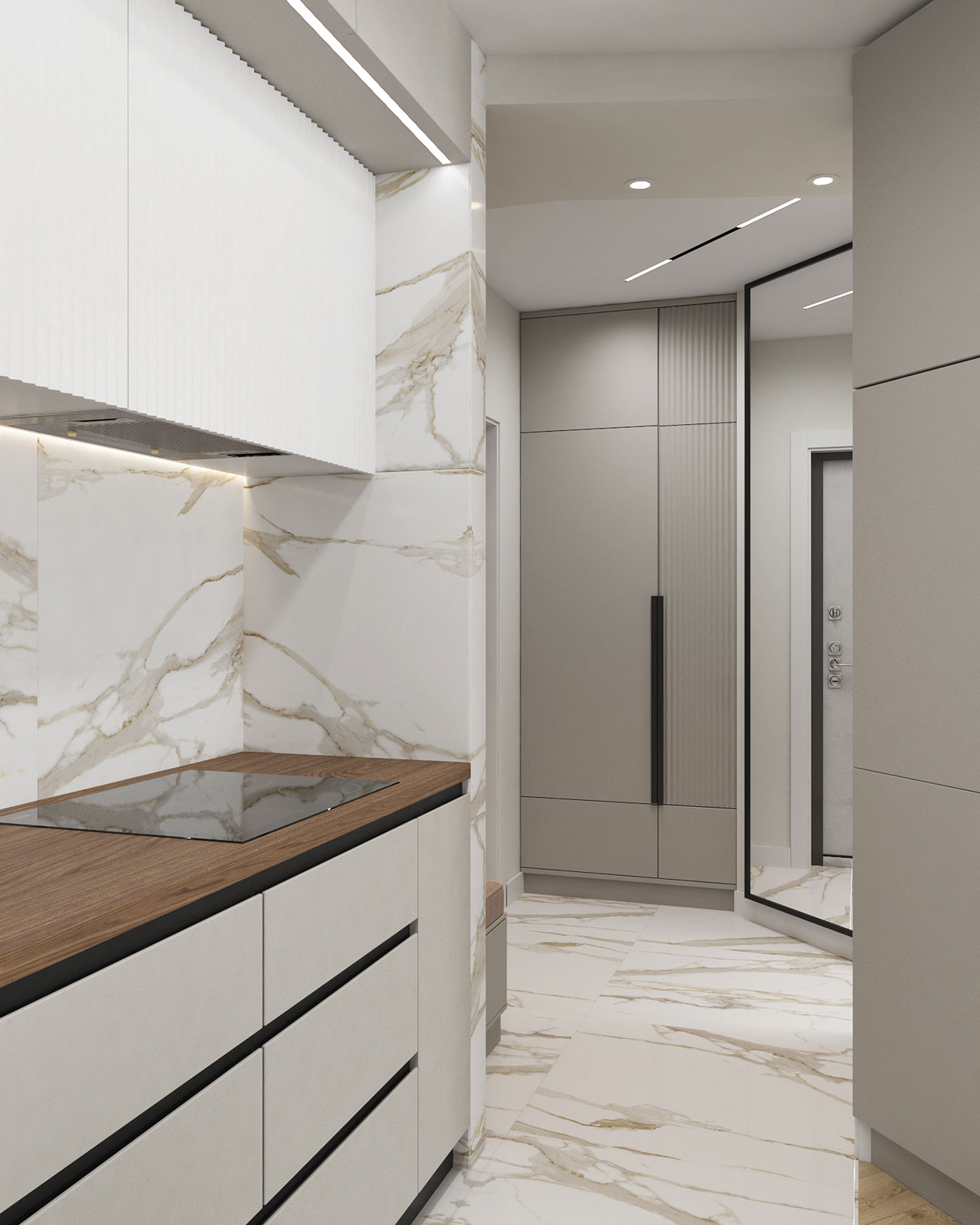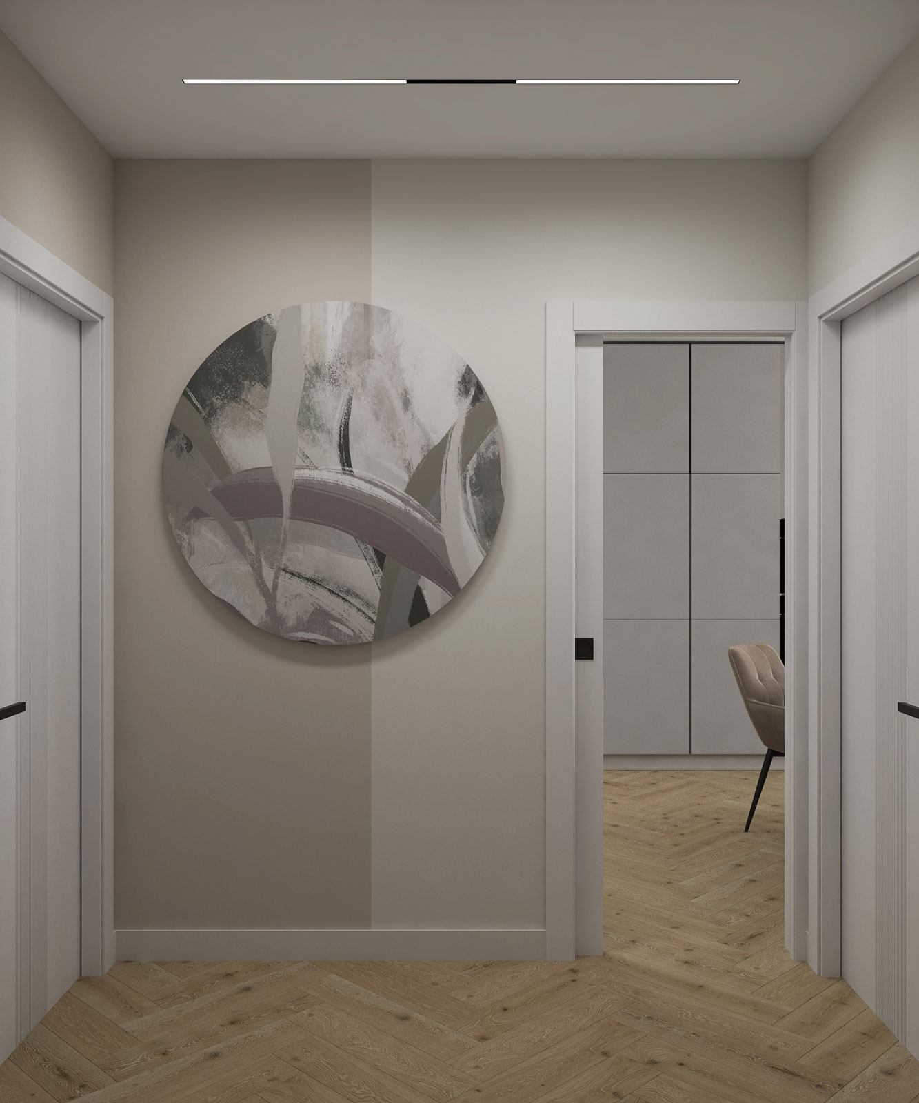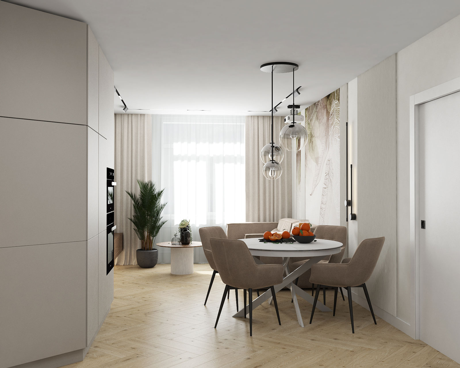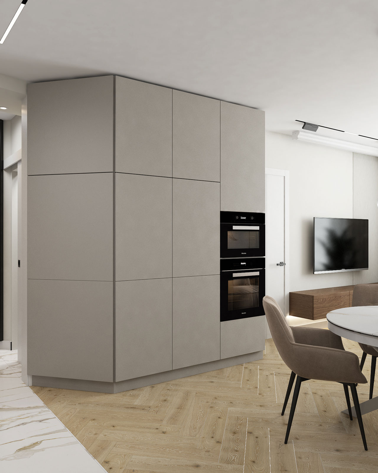• Spacious central zone: The kitchen was relocated from the left wing to the center of the apartment and integrated with the former corridor. This allowed us to create a bright, open multifunctional kitchen-dining-living space of 23.4 m² — the new heart of the home.