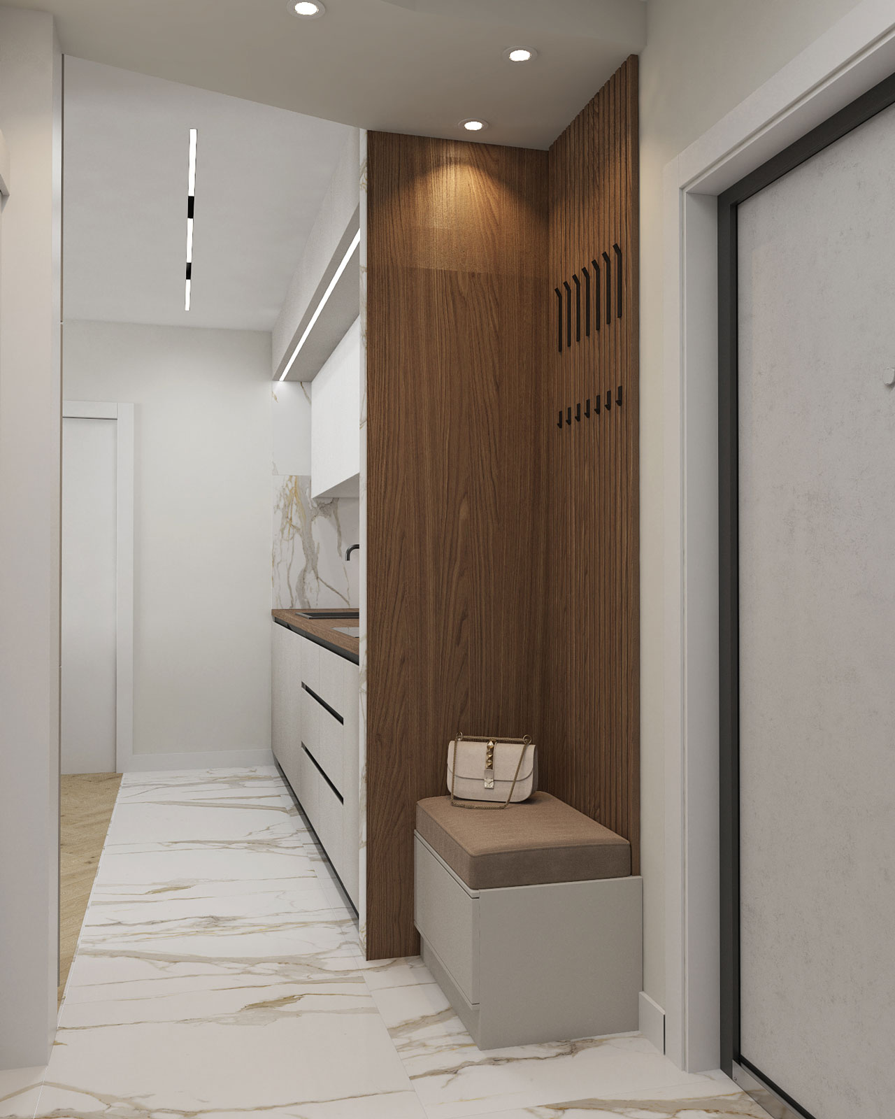 • Optimized entryway: The entrance hall was refined to 3.2 m² with an ergonomic built-in wardrobe (1.4 m²) and smooth transition into the main living space.