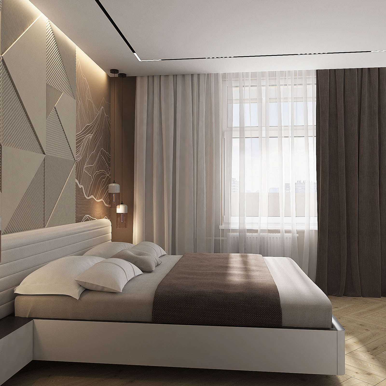 The interior design is modern with Scandinavian elements. A calm palette, lots of light, natural textures, thoughtful zoning and custom furniture.
